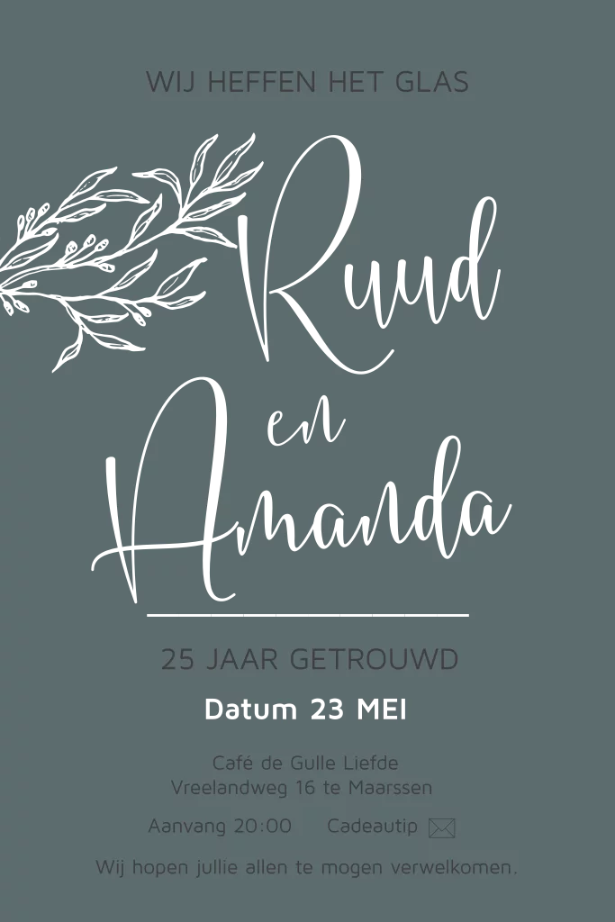 Stijlvolle staande donkergroen kleurige uitnodigingskaart 25 jaar getrouwd in meerdere formaten beschikbaar. Met mooie outline takjes en teksten in écht goud foliedruk gedrukt. Ook mogelijk in andere kleuren en zilver- en koperfolie. Zelf maken!