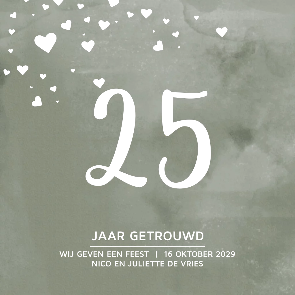Eerdaags jullie zilveren huwelijks jubileum feest geven? Unieke enkele uitnodiging met mint groene aquarel op de ondergrond, hartjes en de teksten op de voorzijde worden gedrukt met écht zilverfolie! Zelf maken!