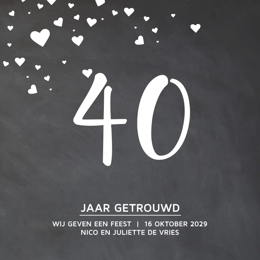 Vrolijke chique uitnodiging voor een 40 jarig huwelijksjubileum feest. Met schoolbord achtergrond en hartjes en tekst gedrukt in écht foliedruk. Zelf aanpassen!