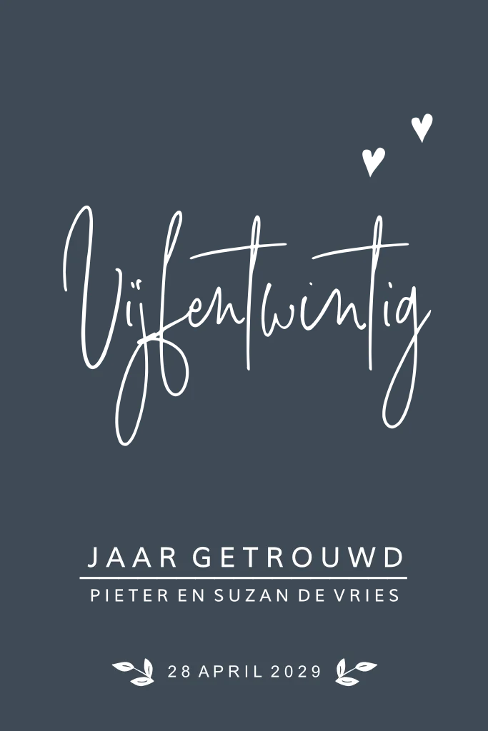 Prachtige enkele donkerblauwe huwelijksjubileum kaart met écht goudfolie. 25 mooi uitgeschreven. Alles staat los en is zelf te bewerken.
