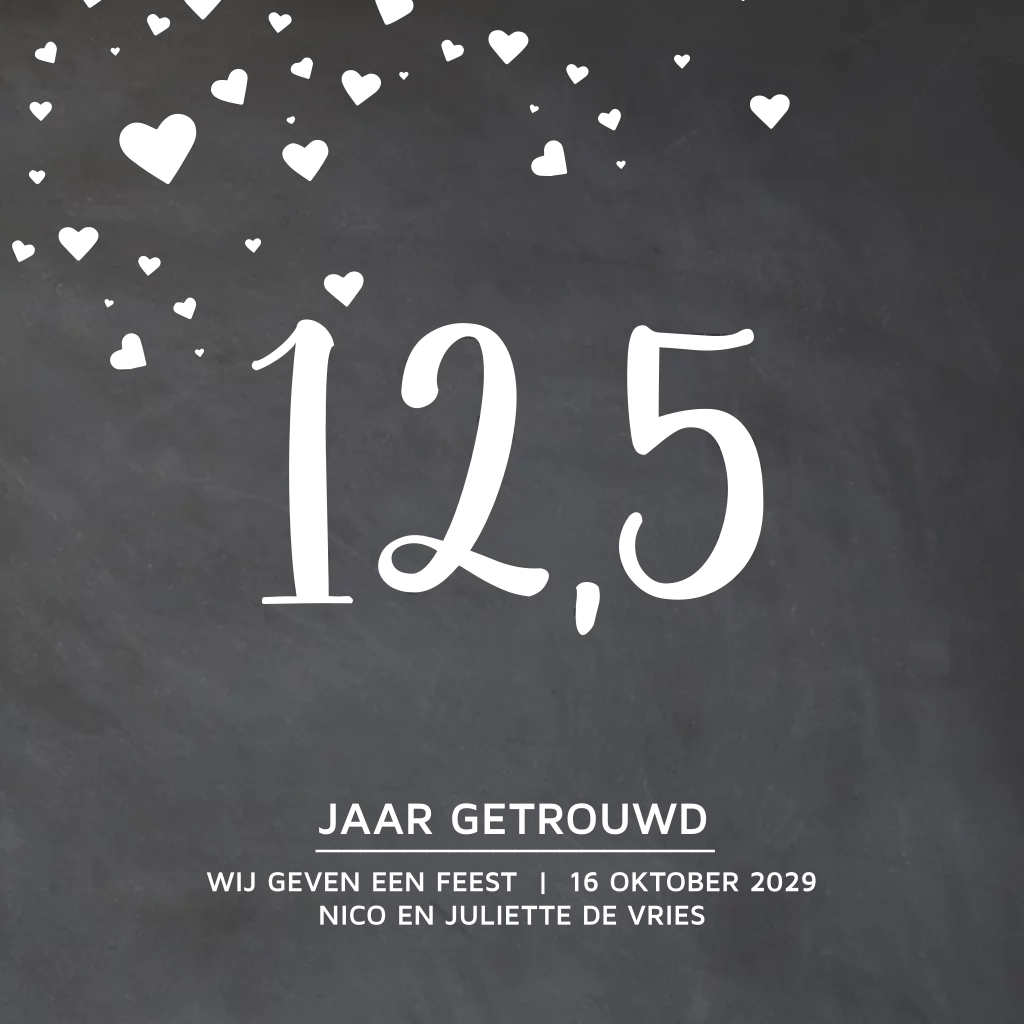 Eerdaags jullie 12,5 jarig huwelijks jubileum feest geven? Unieke enkele uitnodiging met krijtbord print op de ondergrond, hartjes en de teksten op de voorzijde worden gedrukt met écht foliedruk! Zelf maken!