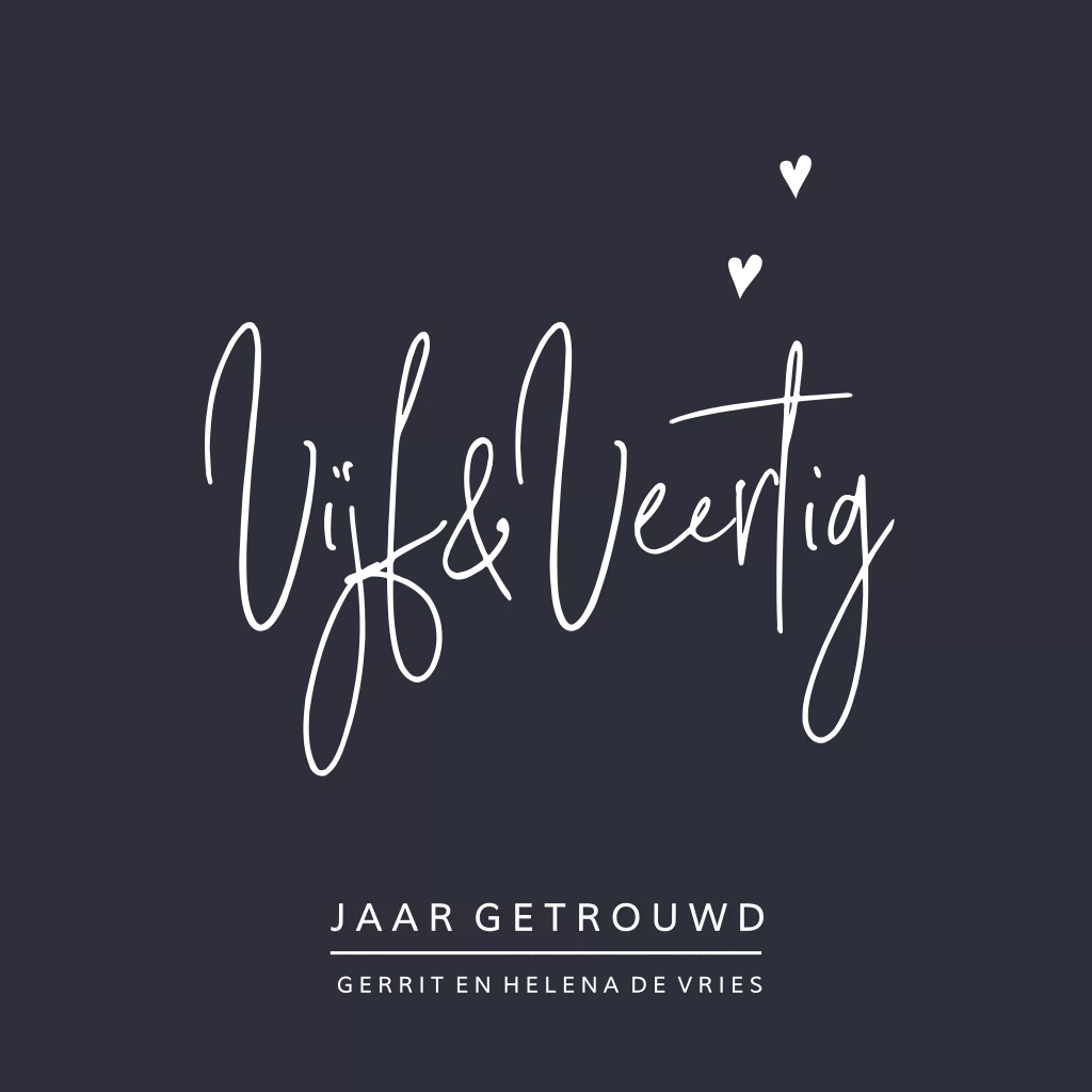Chique uitnodiging voor een 45 jarig huwelijksjubileum. Binnenzijde fotokader voor het plaatsen van een eigen afbeelding. Ondergrond donkerblauw met goudfolie teksten aan de buitenzijde van de kaart.