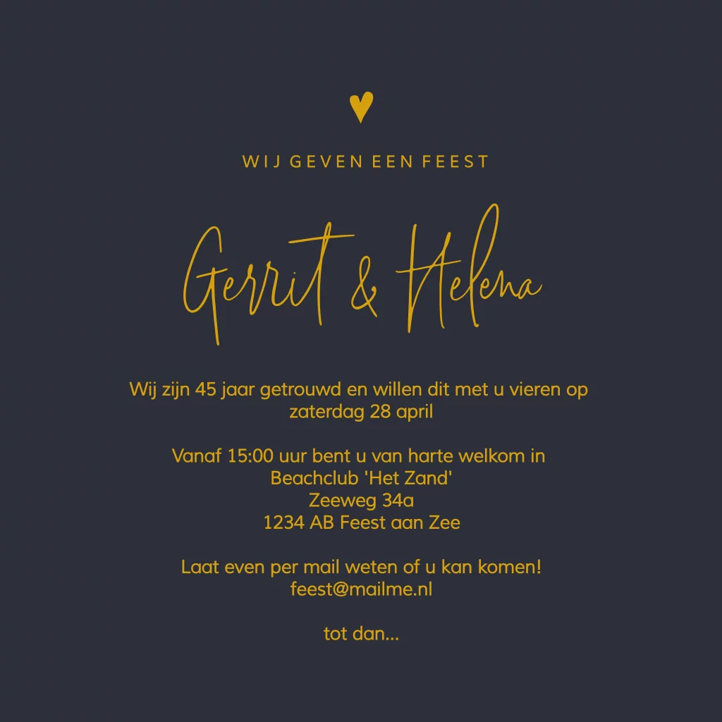 Uitnodiging 45 huwelijksjubileum navy blauw en goudfolie