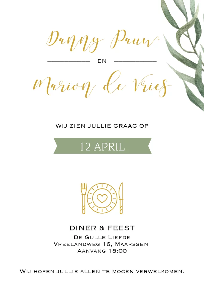 LET OP: Het houten vormpje op dit kaartje wordt niet mee gedrukt, deze is ter voorbeeld. Op die plek kun je straks zelf het échte houten vormpje plakken. Bij je proefdruk krijg je samples van alle kleuren strikjes en houten vormpjes. Botanische huwelijksjubileum kaart met takjes en geovormen en verder rustig. Plak op de voorkant een echt houten hartje en maak zo dit kaartje uniek.