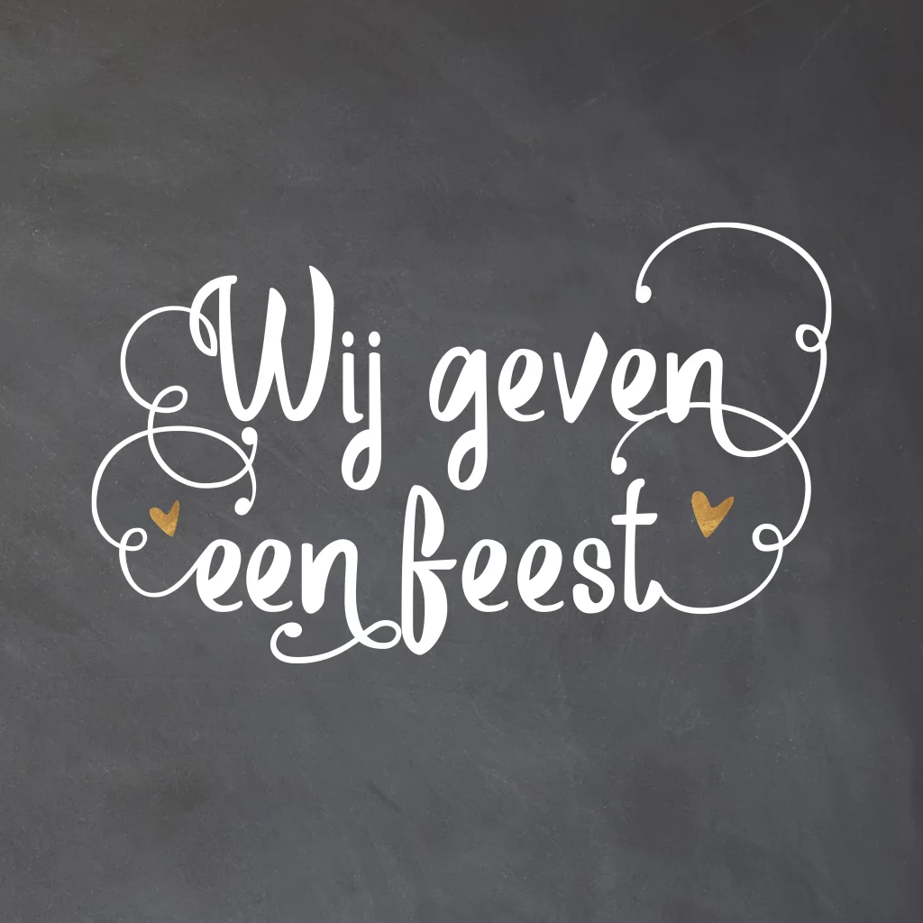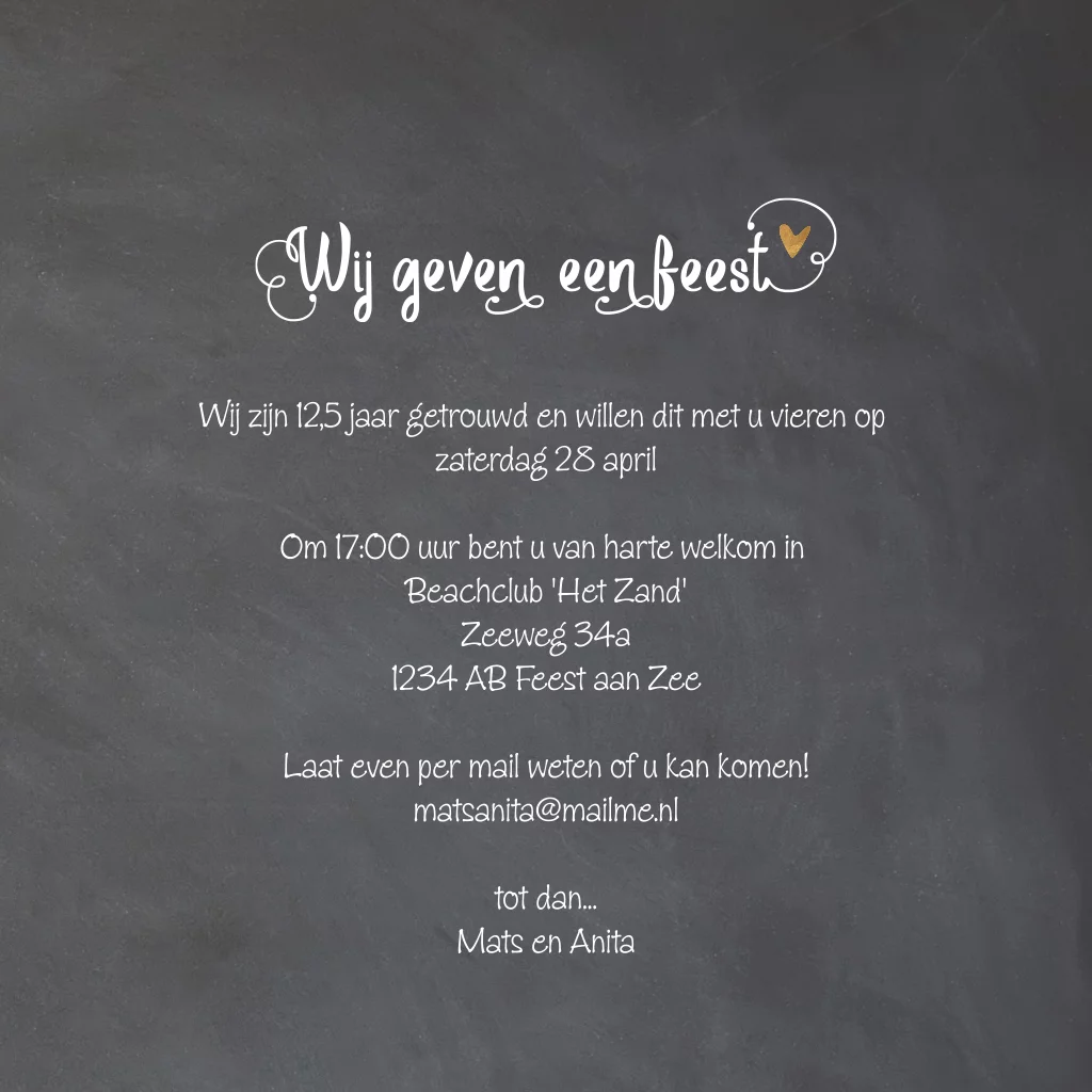Eerdaags jullie 12,5 jarig huwelijksjubileum feest geven? Mooie uitnodiging met krijtbord print en hand lettering met 'Wij geven een feest'.