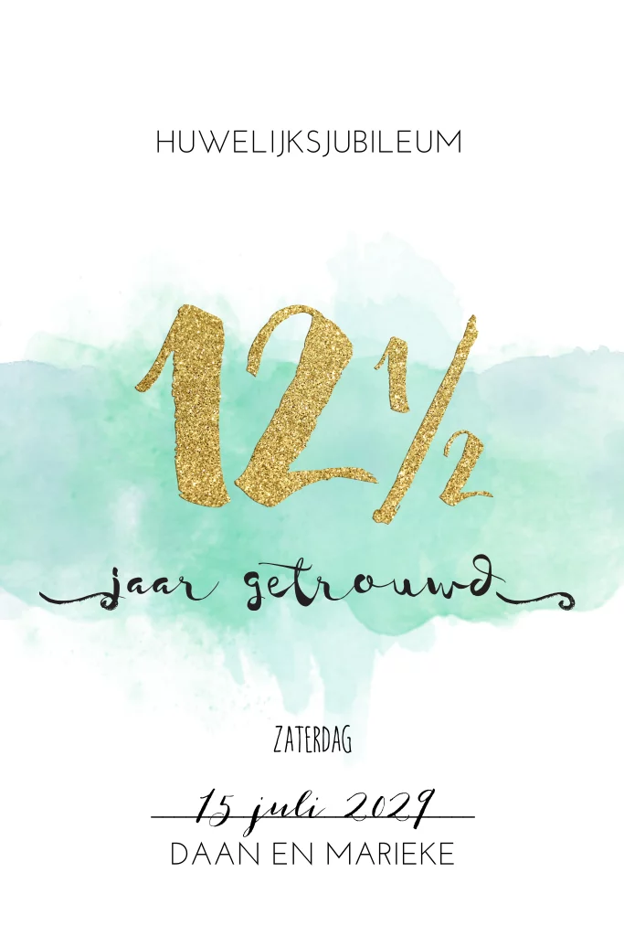 Opzoek naar een romantic chic 12,5 jarig huwelijksjubileum? Met mint groene en blauwe watercolor streep als ondergrond en met veel stijlvolle trouw icoontjes. Zelf maken!