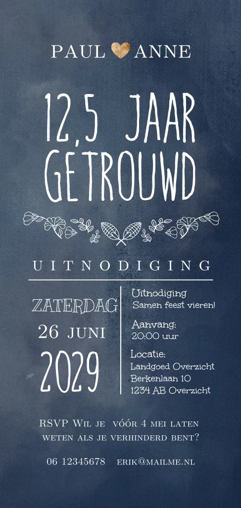 Moderne enkele watercolor grafische 12,5 jarig huwelijksjubileum uitnodiging met outline bloem, lijn, hartje en losse teksten. Extra lang formaat 10x21cm.