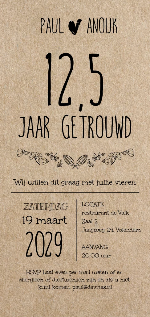 Moderne enkele kraft look grafische uitnodiging 12,5 jaar getrouwd met out-line bloem, lijn, hartje en losse teksten. Extra lang formaat 10x21cm.
