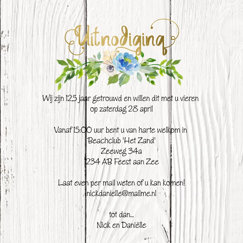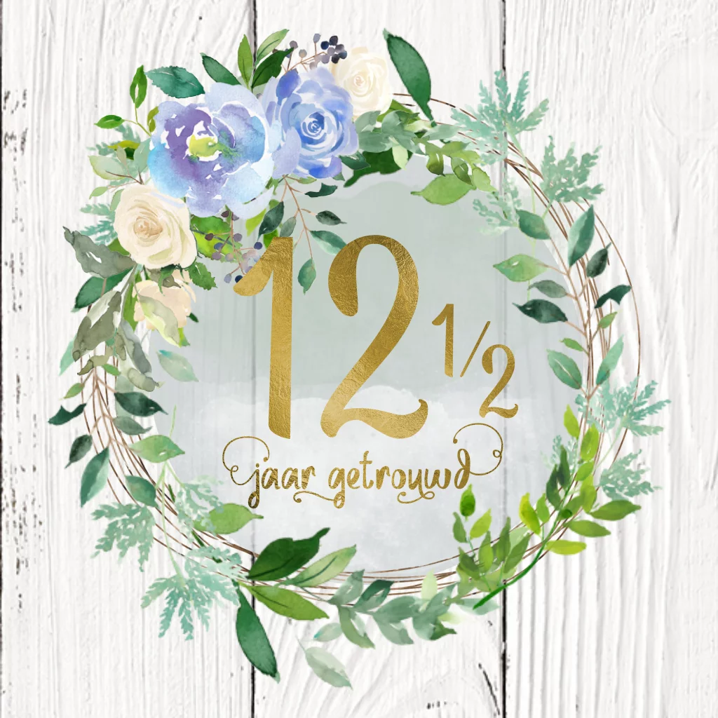 Eerdaags jullie 12,5 jarig huwelijks jubileum feest geven? Mooie uitnodiging met hout look achtergrond, goud look (geen echt goud inkt) sierlijke handlettering en krans van bladgroen en hortensia bloemen in watercolor look