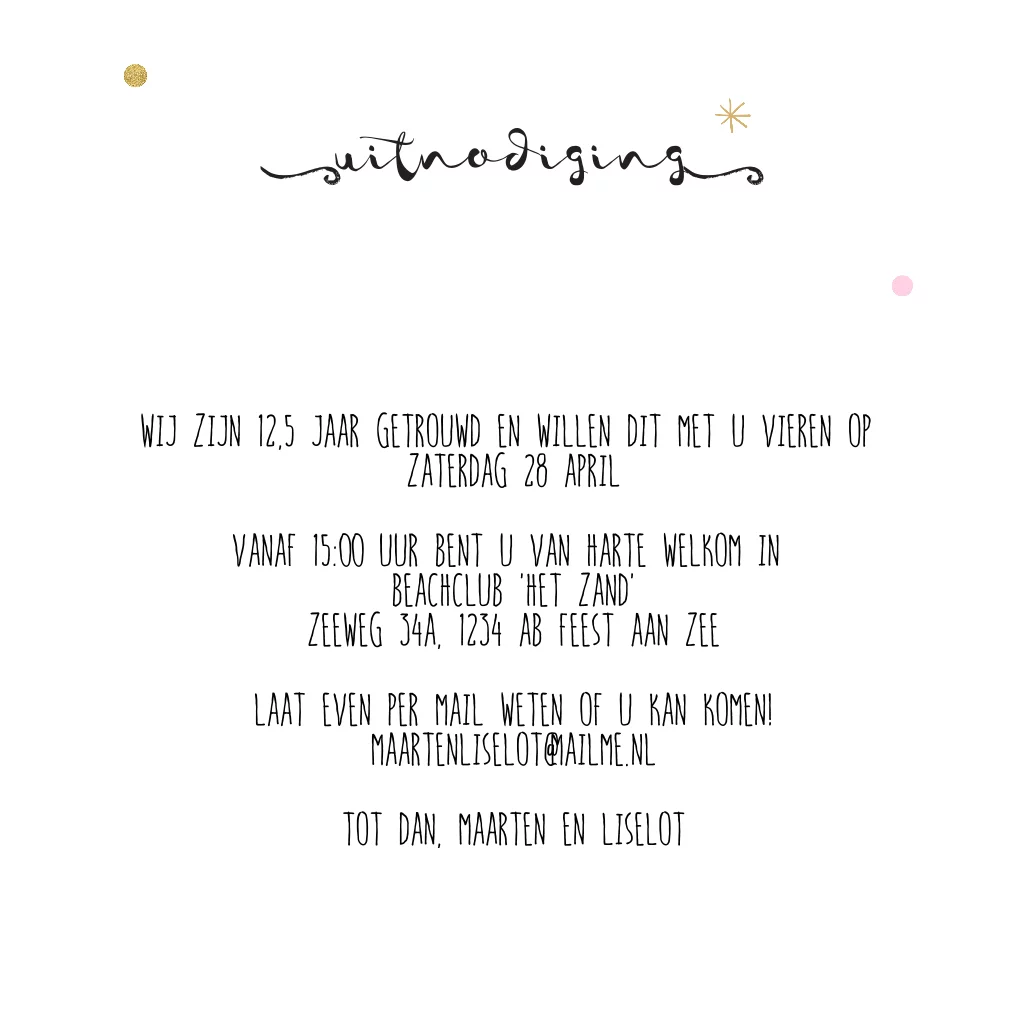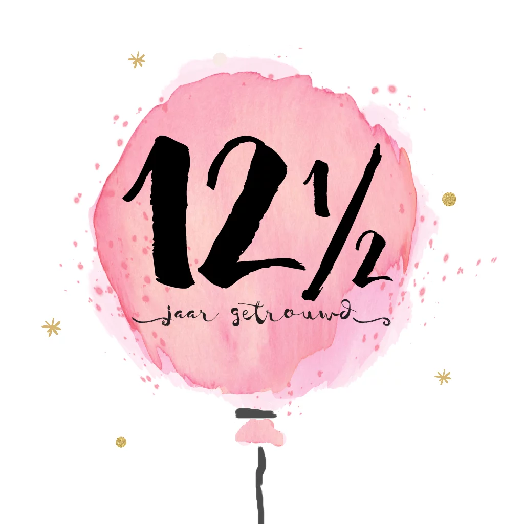 Eerdaags jullie 12,5 jarig huwelijks jubileum feest geven? Uniek uitnodiging met waterverf look, snippers en dots met het hippe hand lettering.