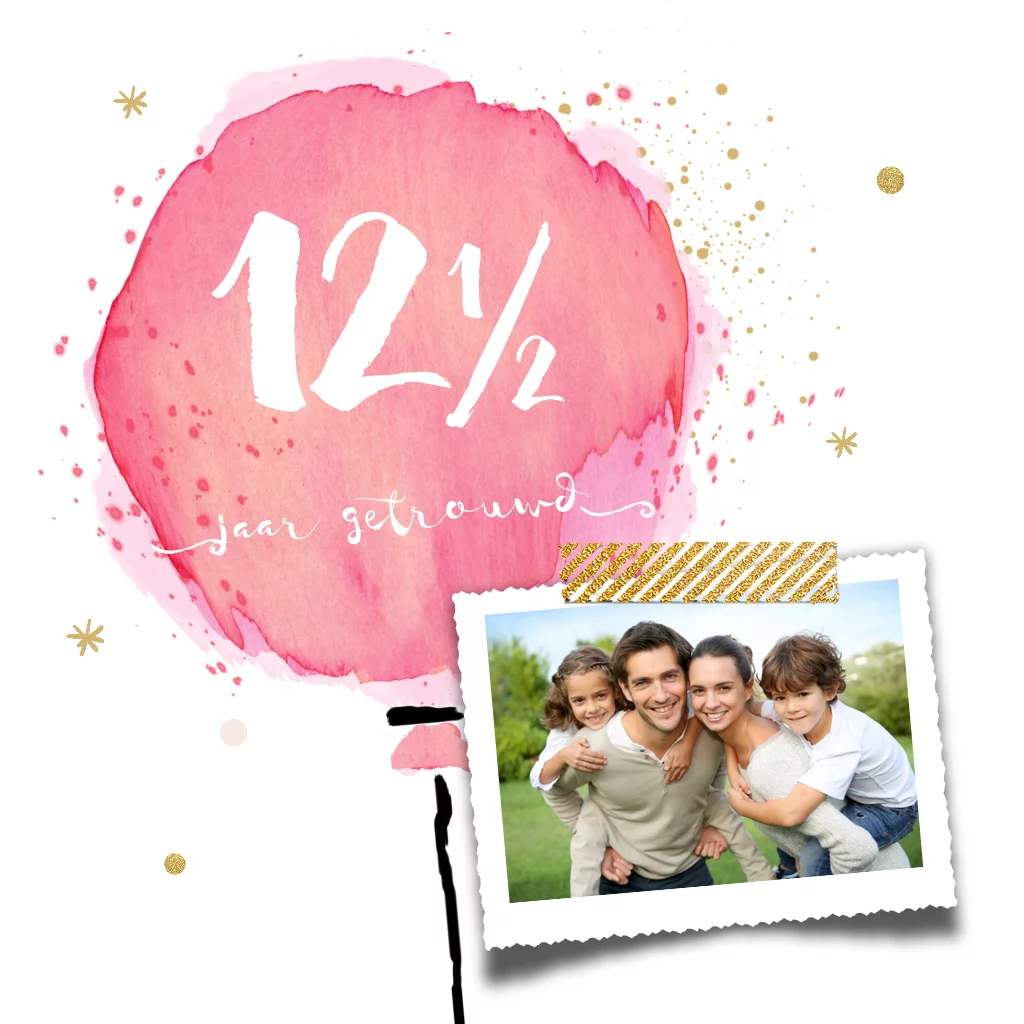 Eerdaags jullie 12,5 jarig huwelijks jubileum feest geven? Uniek foto uitnodiging ballon met waterverf effect, snippers, dots met het hippe hand lettering.