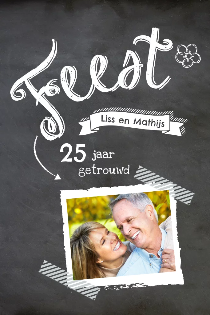 Enkele foto 25 jarig huwelijksuitnodiging met krijtbord print