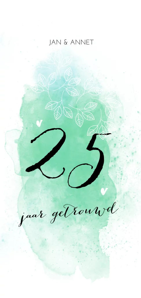 Uniek extra lang formaat uitnodiging 25 jarig huwelijksjubileum met mint groene watercolor look, witte bladeren en hartjes design. Zelf maken!