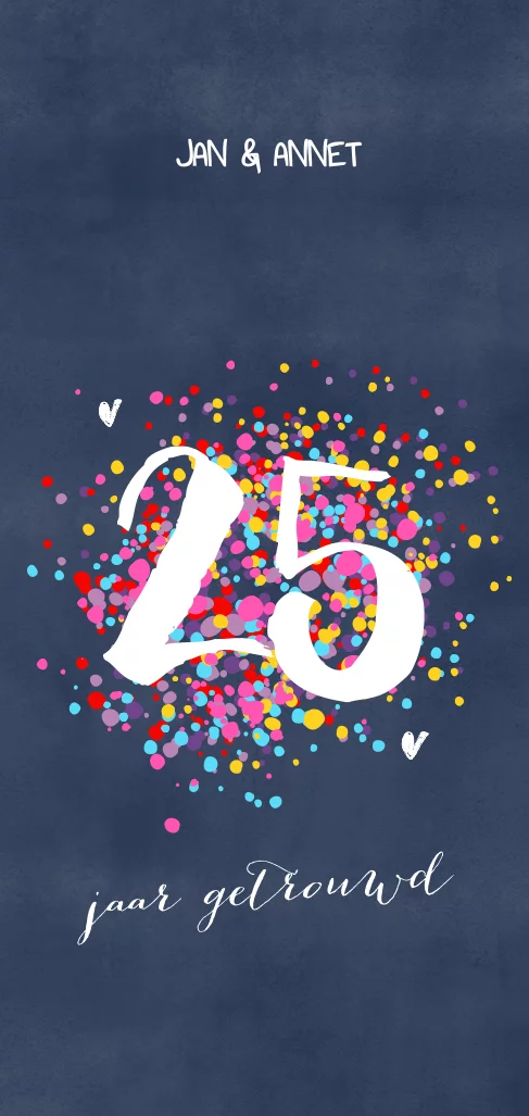 Uniek extra lang formaat uitnodiging 25 jarig huwelijksjubileum met stijlvolle donkerblauwe ondergrond, fel gekleurde confetti en kleine hartjes. Zelf maken!