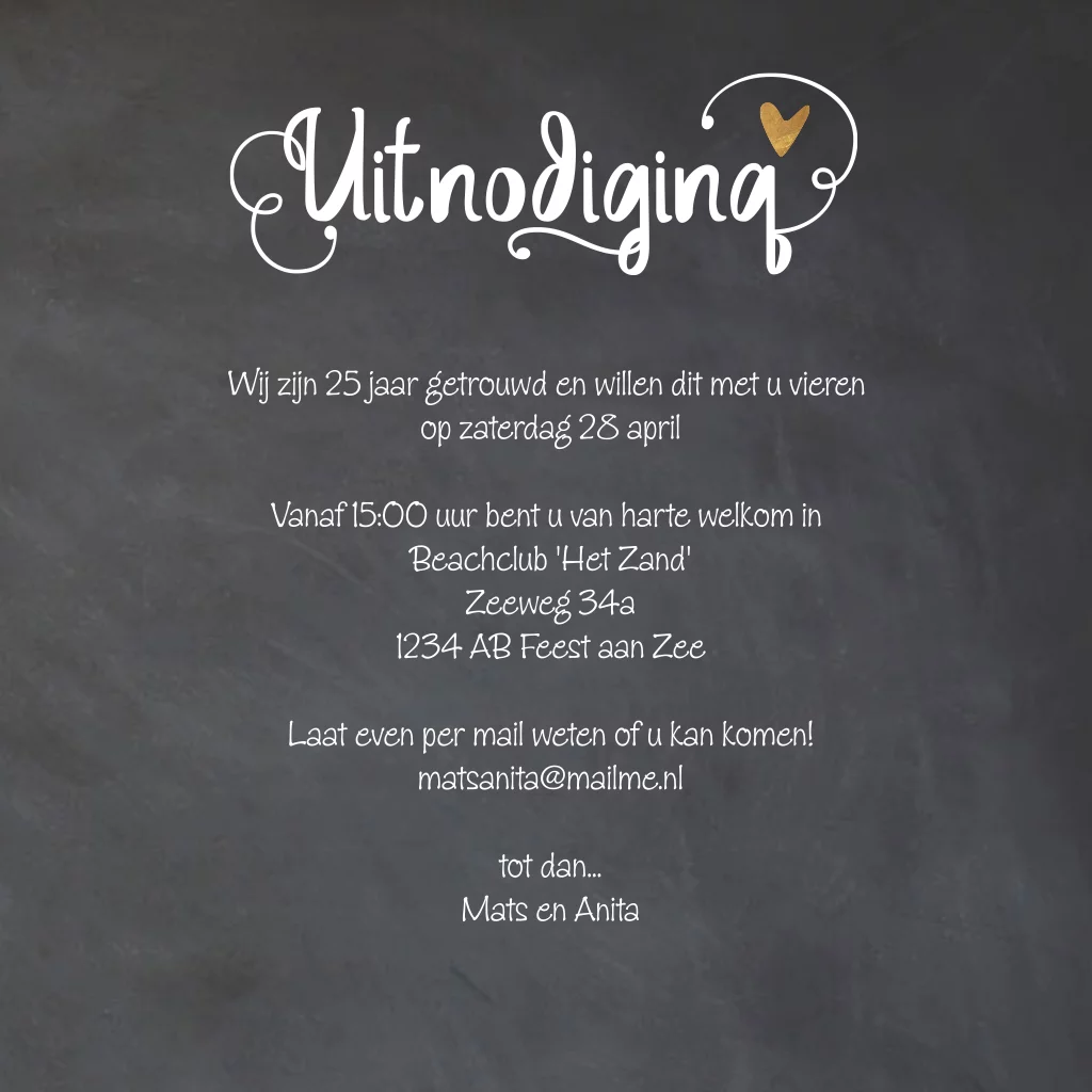 Eerdaags jullie 25 jarig huwelijks jubileum feest geven? Mooie uitnodiging met krijtbord print en hand lettering.