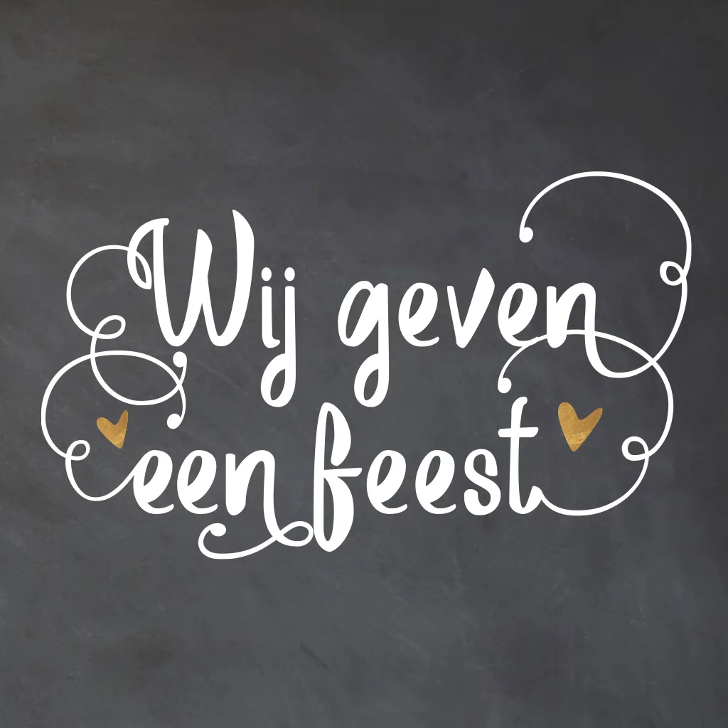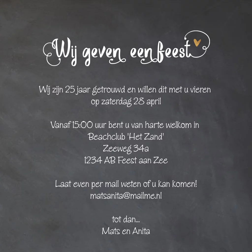 Eerdaags jullie huwelijksjubileum feest geven? Mooie uitnodiging met krijtbord print en sierletters met Wij geven een feest
