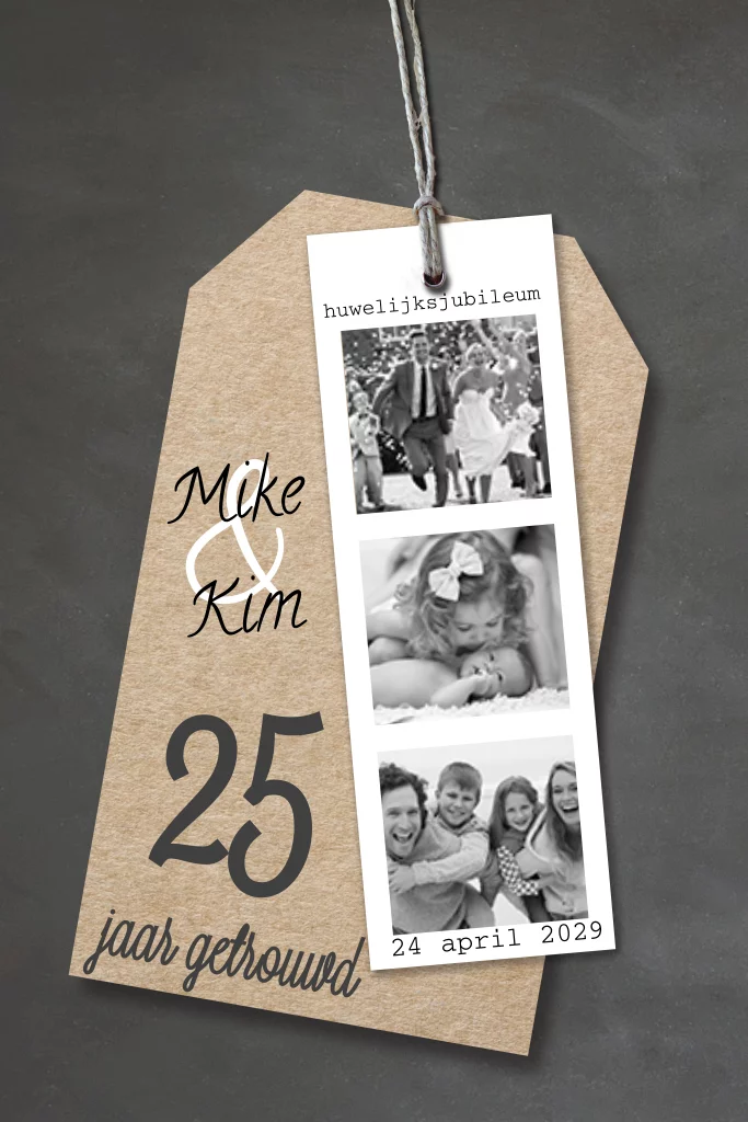 Hippe enkele foto 25 jubileumfeest uitnodiging met krijtbord print, fotostrip, kraft label en losse teksten. Meerder formaten mogelijk. Aan 2 zijdes te bedrukken en te ontwerpen.