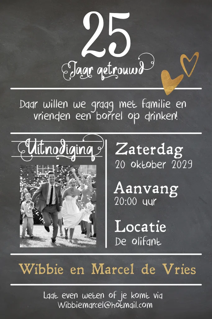 25 jaar getrouwd? Leuke enkele foto uitnodiging met krijtbord print, sierletters en losse icoontjes.