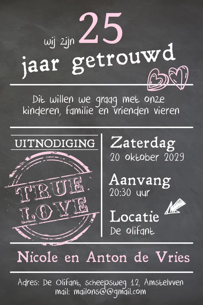 Enkele uitnodiging 25 jaar getrouwd krijtbord look