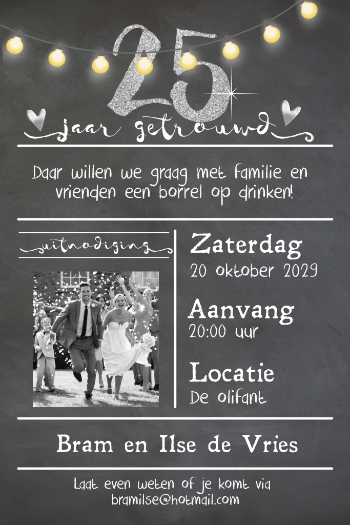 Enkele foto uitnodiging 25 jaar getrouwd krijtbord lichtjes