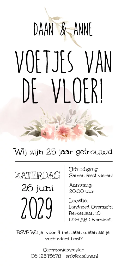 Stijlvolle enkele witte grafische 25 jarig huwelijksjubileum kaart met prachtige watercolor geschilderde bloemen in boeket vorm, lijntjes en losse teksten. Extra lang formaat 10x21cm