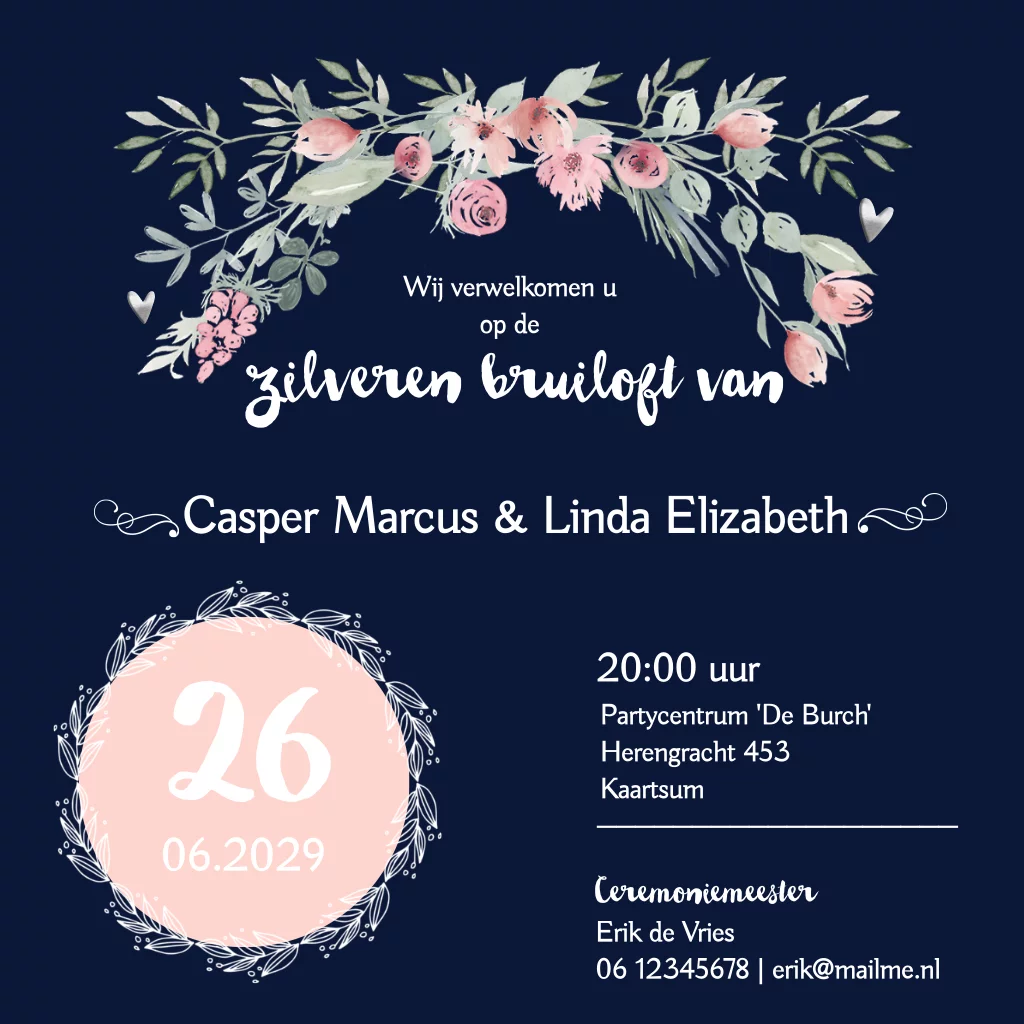 Eerdaags jullie zilveren huwelijksfeest vieren? Unieke botanische uitnodiging met een chic donkerblauw ondergrond, zilver look hartjes watercolor bloemen in een zalm roze tint. Zelf maken!