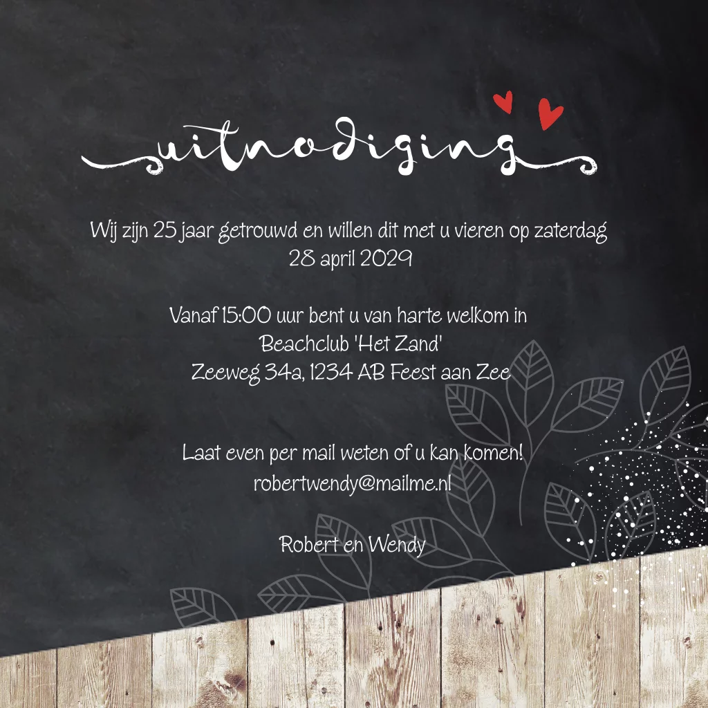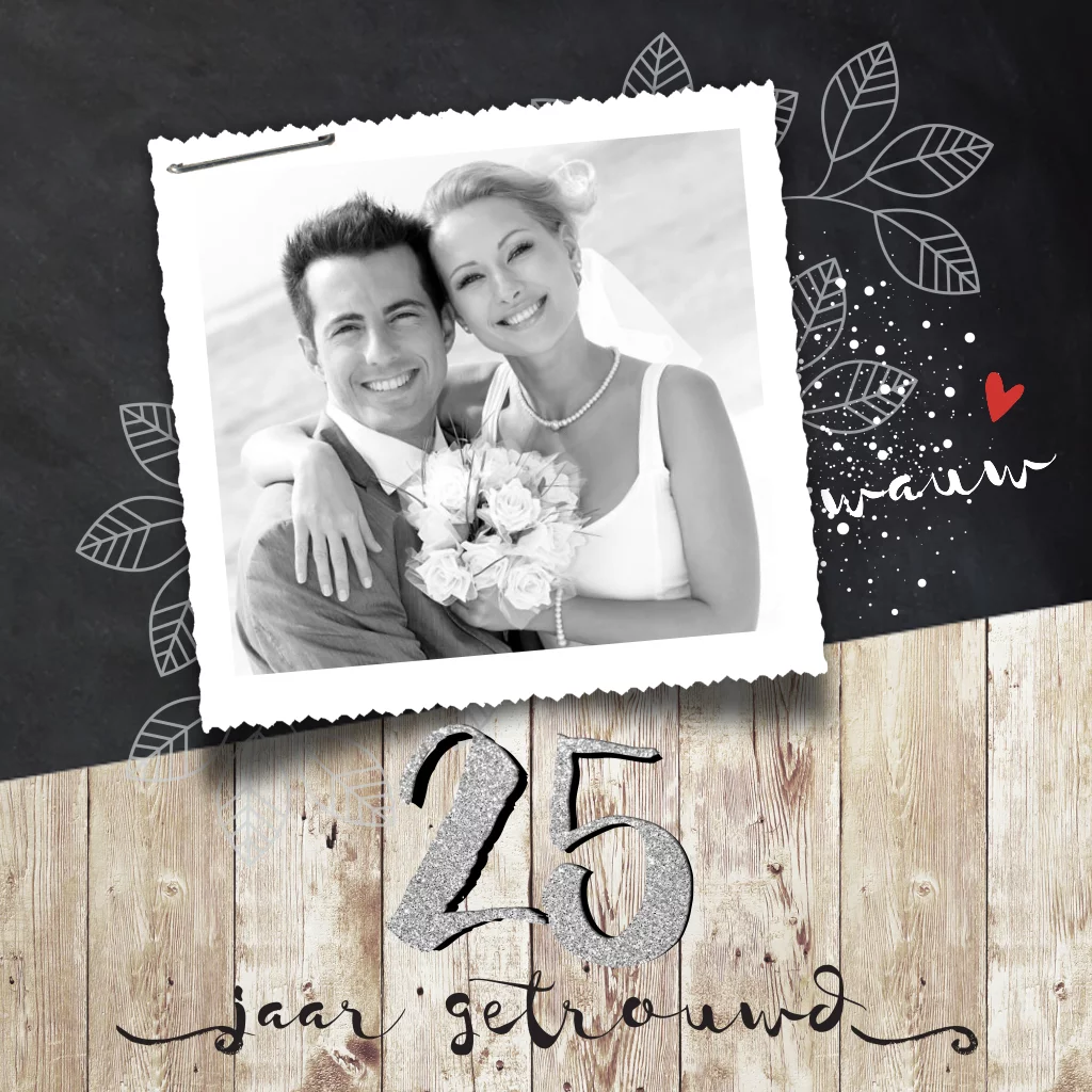Wat een mooie foto uitnodiging voor jullie 25 jarig huwelijks jubileum feest! Met zilver gekleurde cijfers (geen echt zilver inkt), spetters, handlettering, foto kader en krijtbord en hout look achtergrond.