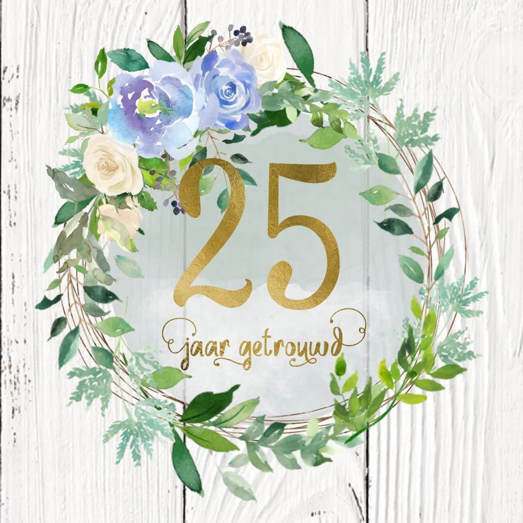 Eerdaags jullie 25 jarig huwelijks jubileum feest geven? Mooie uitnodiging met hout look achtergrond, goud look (geen echt goud inkt) sierlijke handlettering en krans van bladgroen en hortensia bloemen in watercolor look