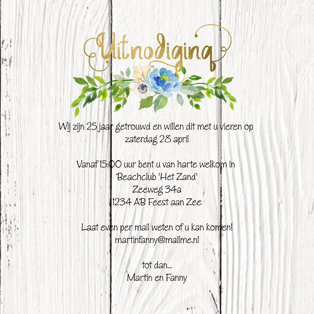Romantische 25 jaar uitnodiging met hout look en bloemen