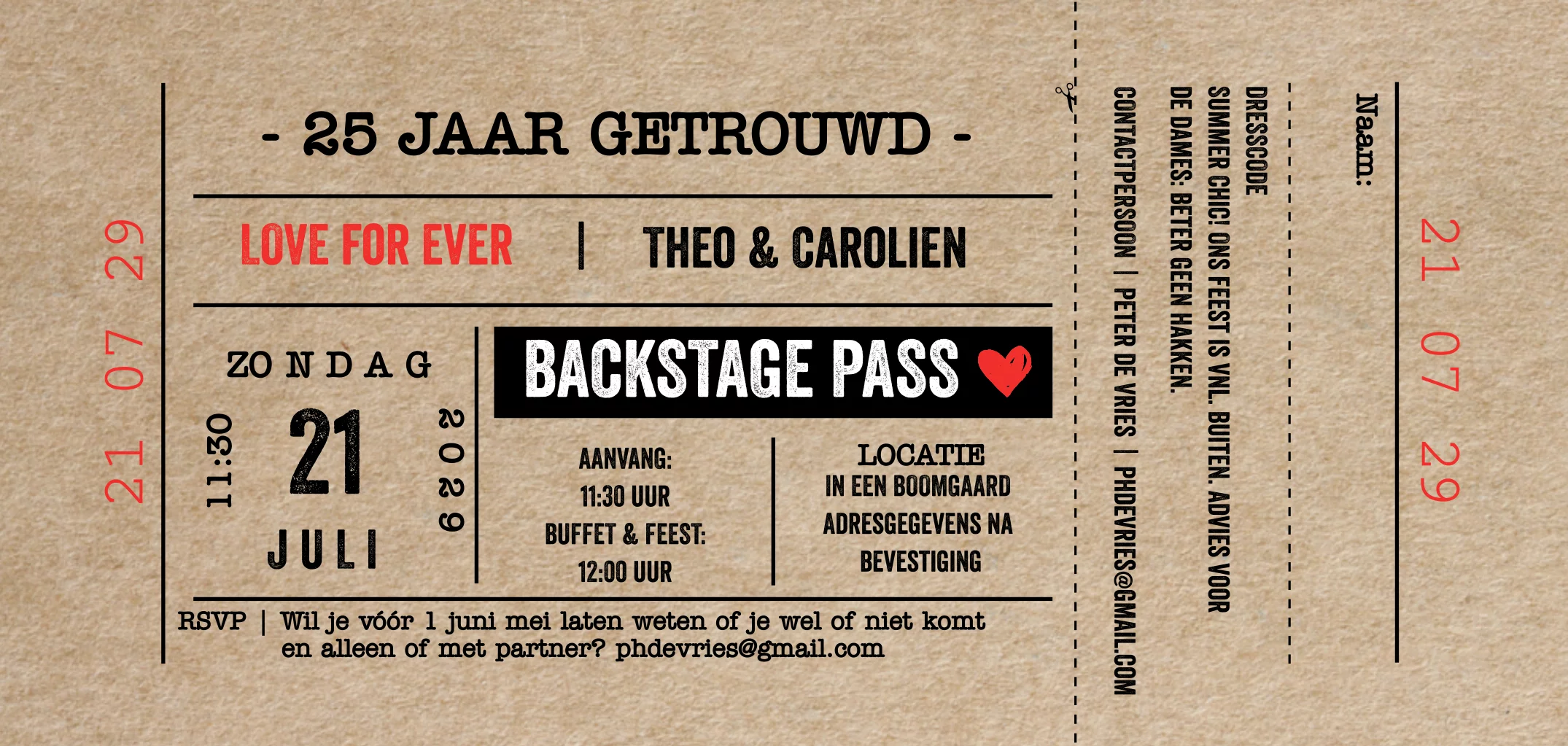 Opzoek naar een hippe panorama huwelijks jubileumkaart 25 jaar getrouwd die lijkt op een toegangskaart van festival of concert? Uitnodiging met kraft look op de ondergrond en lijn grid. Teksten zijn allemaal aan te passen. Zelf maken.