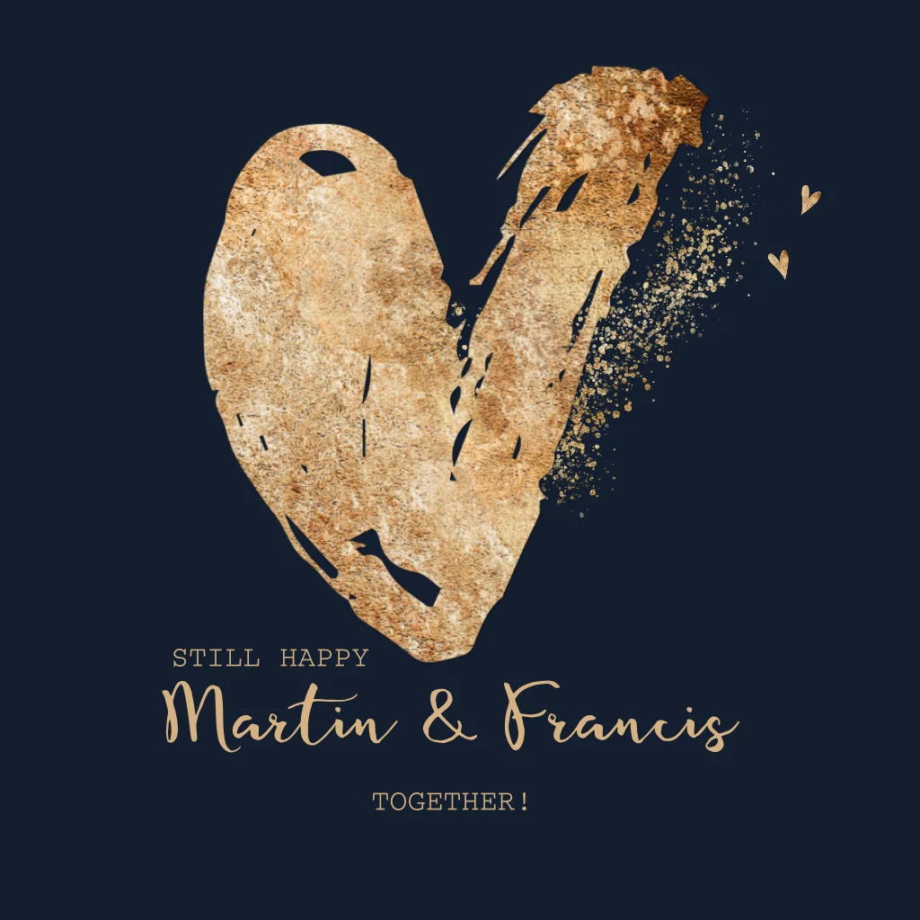 Trendy jubileumskaart in donkerlbauw, met groot goudkleurig hart in verf look. (geen echt goud). Aan de binnenzijde 2 goudkleurige fotokaders voor het plaatsen van een eigen foto.