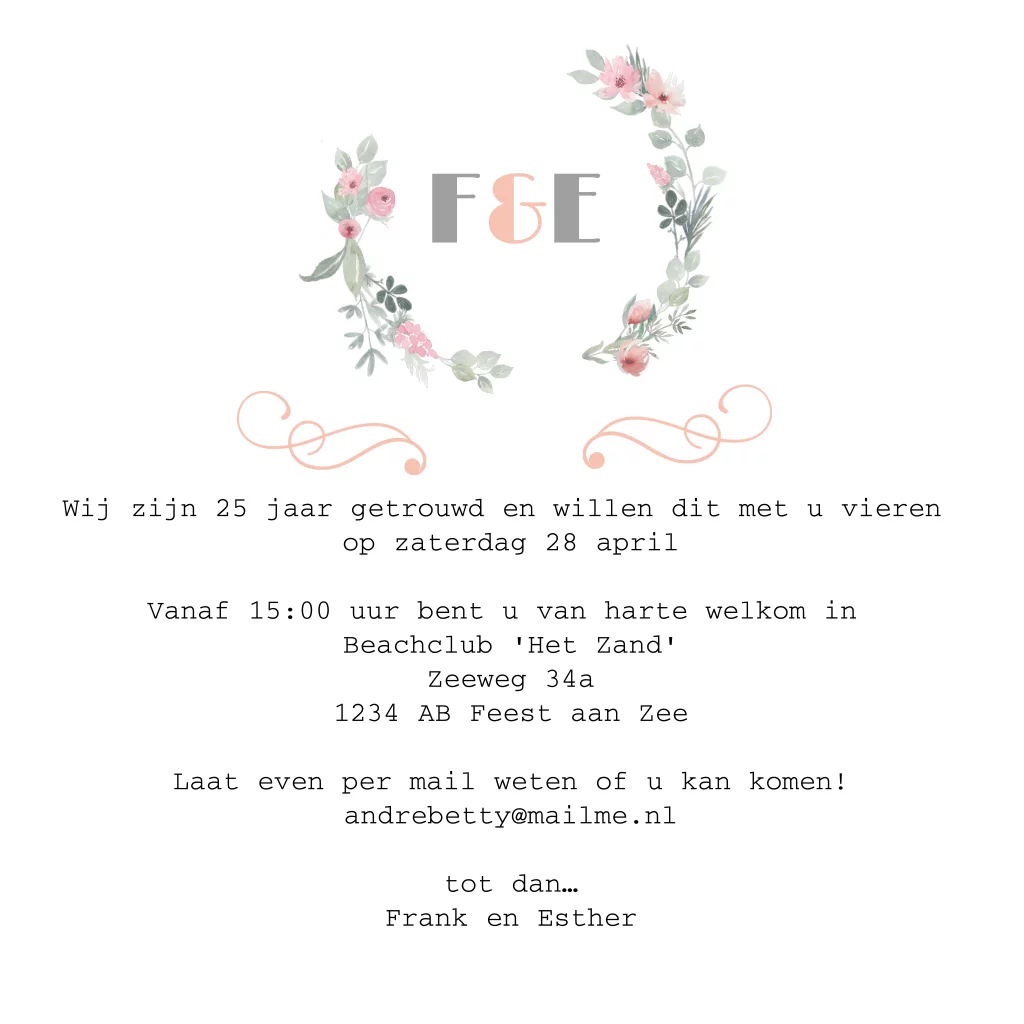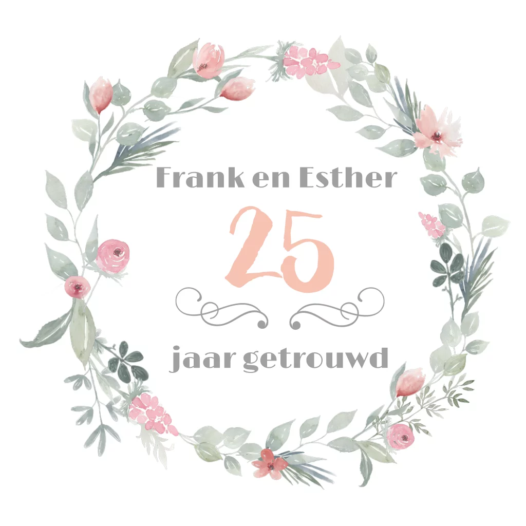 Wat een mooie uitnodiging voor jullie 25 jarig huwelijks jubileum feest! Met watercolor bloemen krans in zachte pasteltinten.