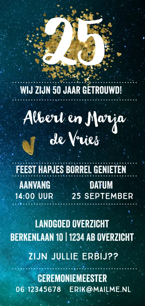 Moderne staande sterren hemel uitnodiging voor jullie 25 jarig huwelijksjubileum feest! Met heelal afbeelding, lijntjes voor de tekst en losse goudfolie look hartjes. Alles staat los en is te bewerken!