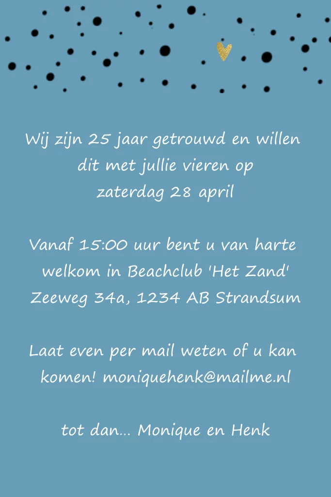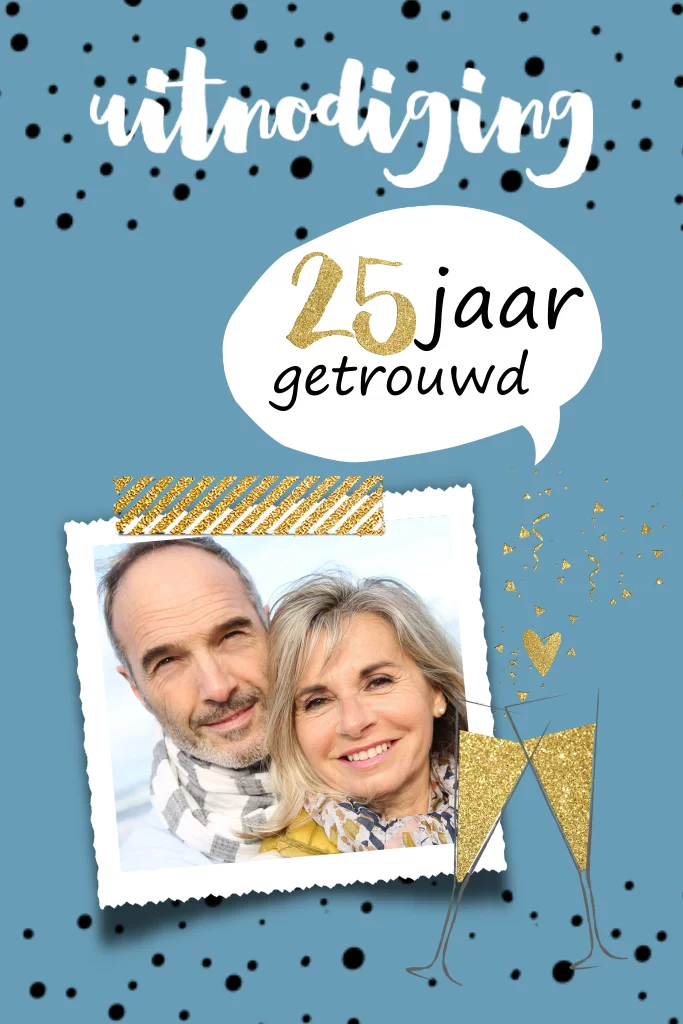 Eerdaags jullie 25 jarig huwelijks jubileumfeest geven? Mooie staande foto uitnodiging met goud look (geen echt goud inkt) blauw met confetti op de ondergrond, champagne glazen en tekstballon.