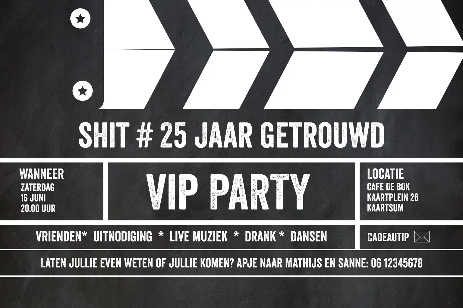 Movie klapper bord uitnodiging voor een 25 jarig huwelijks feest. Liggende kaart met foliedruk, thema film, krijtbord, vlakverdeling. Zelf maken.