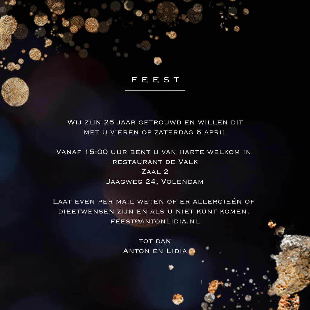 Prachtige uitnodiging voor een jubileum 25 jaar getrouwd met feestelijke blauwe ondergrond en goudlook confetti snippers.