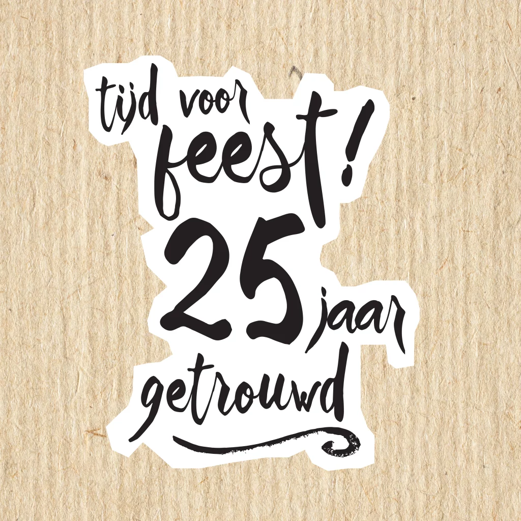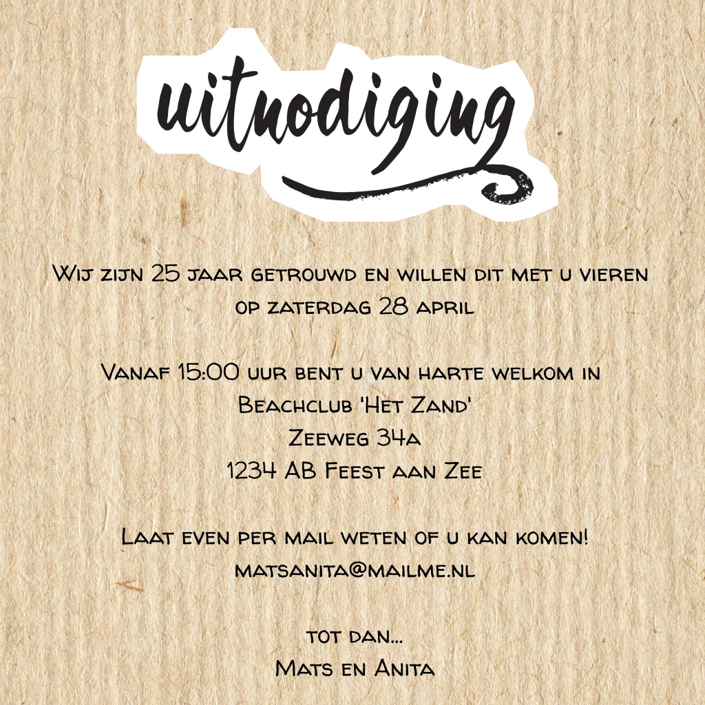 Eerdaags jullie 25 jarig huwelijks jubileum feest geven? Unieke uitnodiging met cartoon achtige lettertypes op een wit grof vlak met op de ondergrond een kraft design.