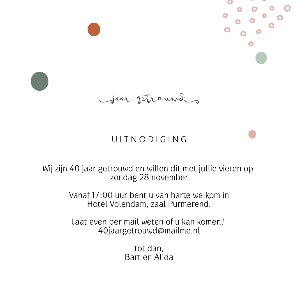 Feestelijke vierkante 40 jaar getrouwd uitnodiging met bubbels, confetti en champagne glazen gevuld met echt goud folie druk.