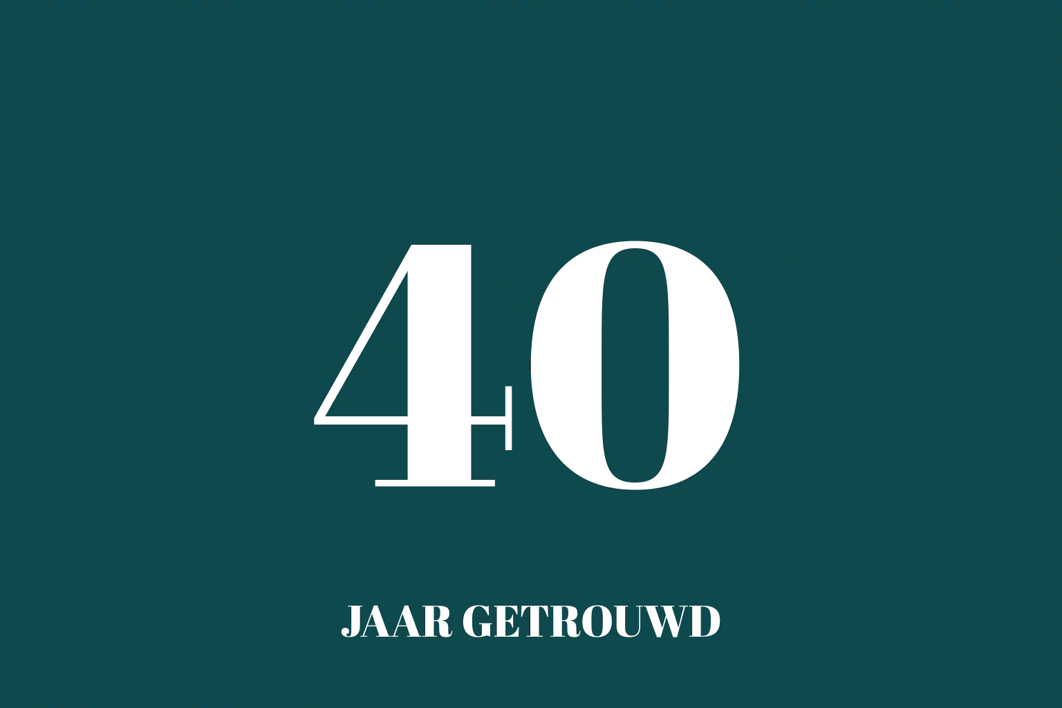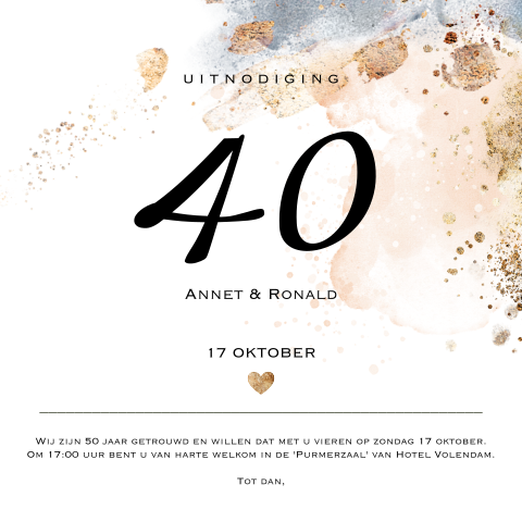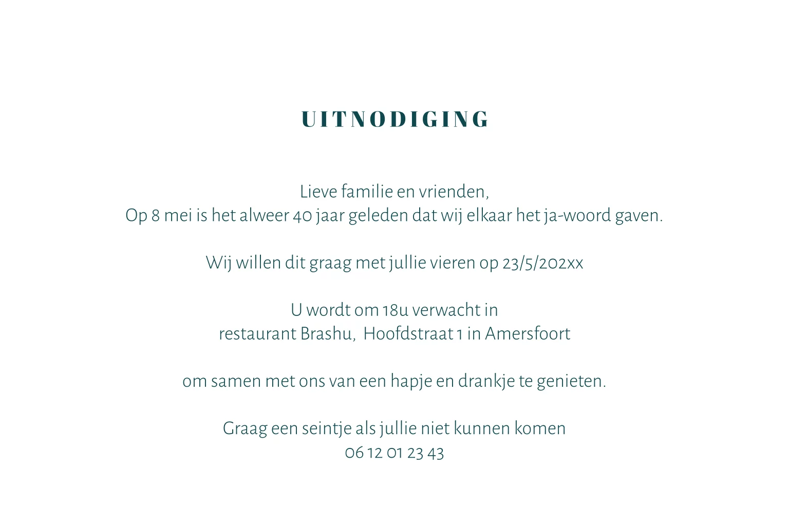 Liggende 40 jarige huwelijks jubileum uitnodiging met donkerblauwe kleur en gedrukt met folie. Alles staat los en is zelf te bewerken.
