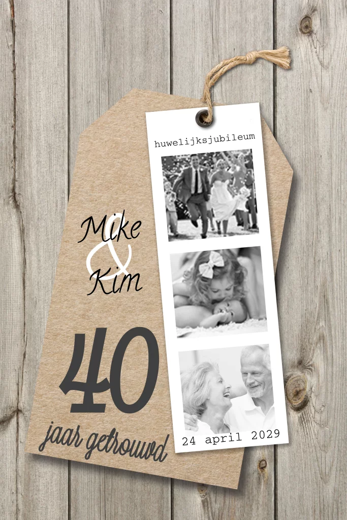 Stijlvolle enkele foto 40 jubileumfeest uitnodiging met hout print, fotostrip, kraft label en losse teksten. Meerder formaten mogelijk. Aan 2 zijdes te bedrukken en te ontwerpen.