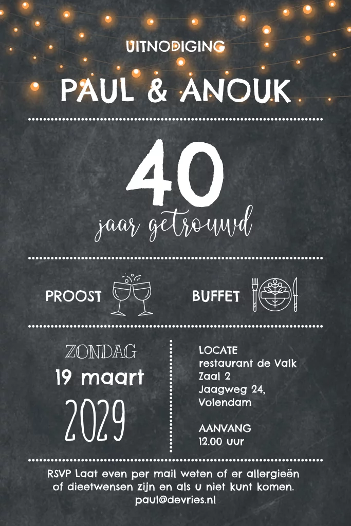 Feestelijke enkele uitnodiging 40 jaar getrouwd met krijtbord look achtergrond, lampjes en lijnspel.
