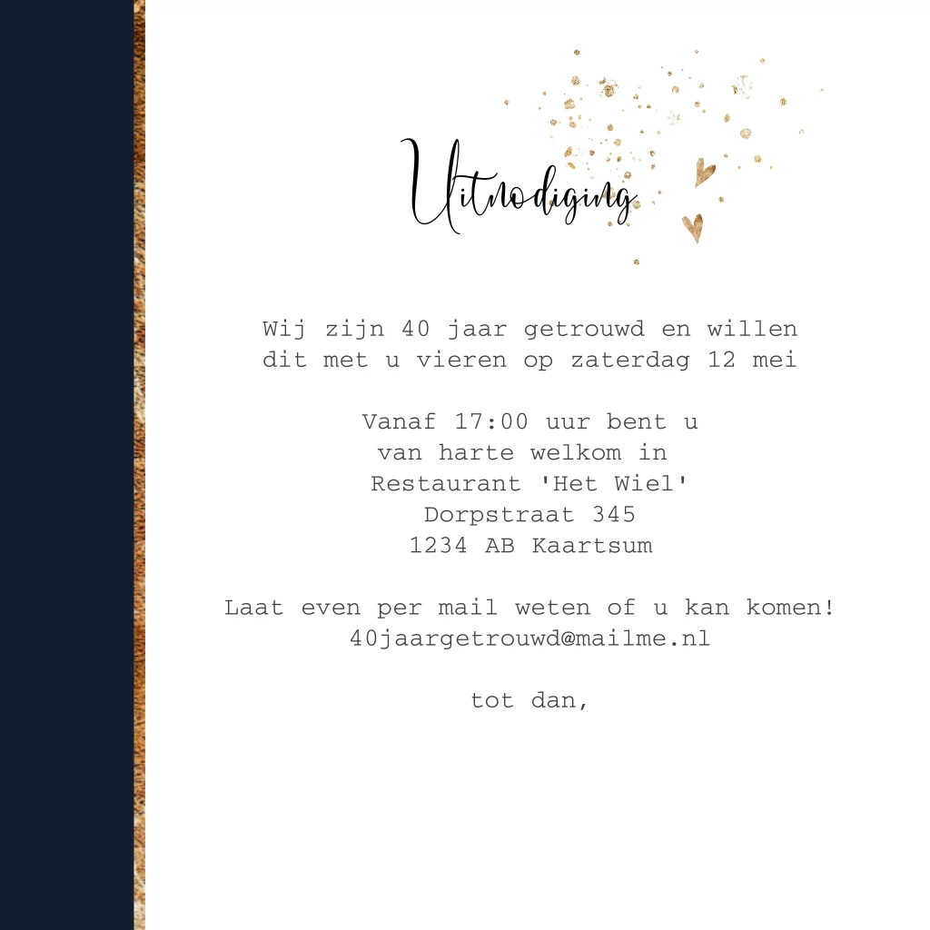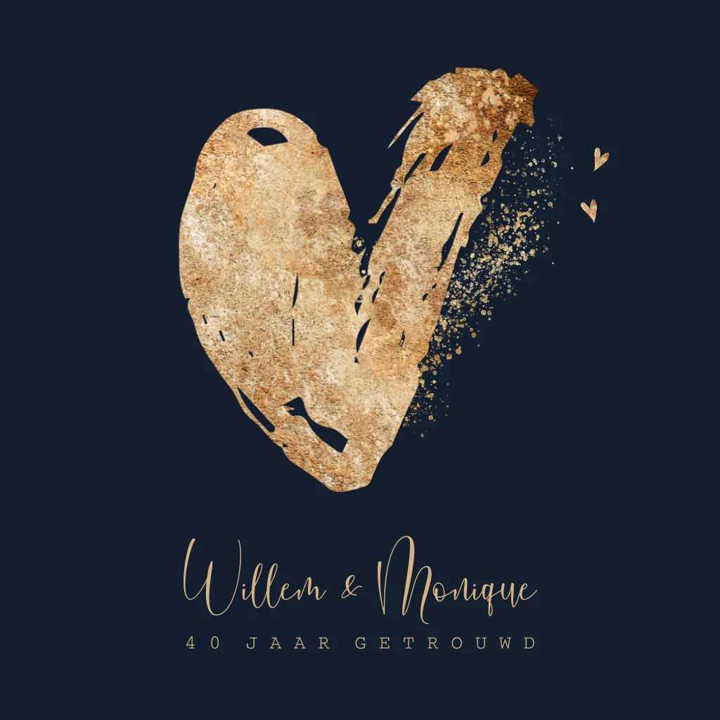 Trendy 40 jarig jubileumkaart uitnodiging in donkerblauw, met groot goudkleurig hart in verf look. (geen echt goud). Aan de binnenzijde 2 goudkleurige fotokaders voor het plaatsen van een eigen foto.