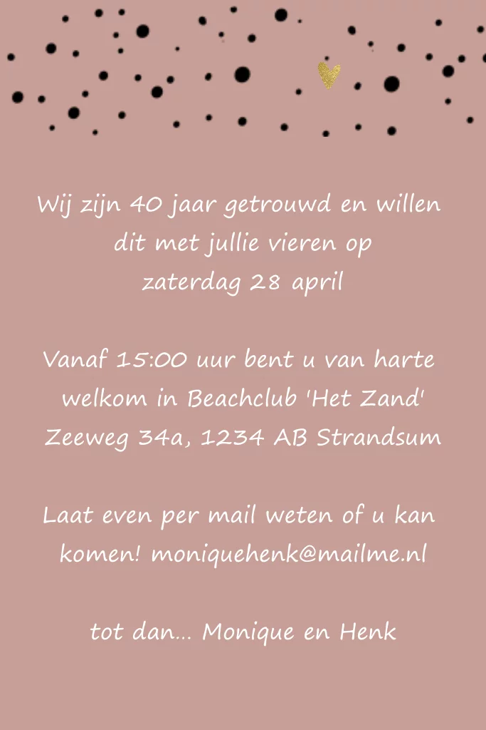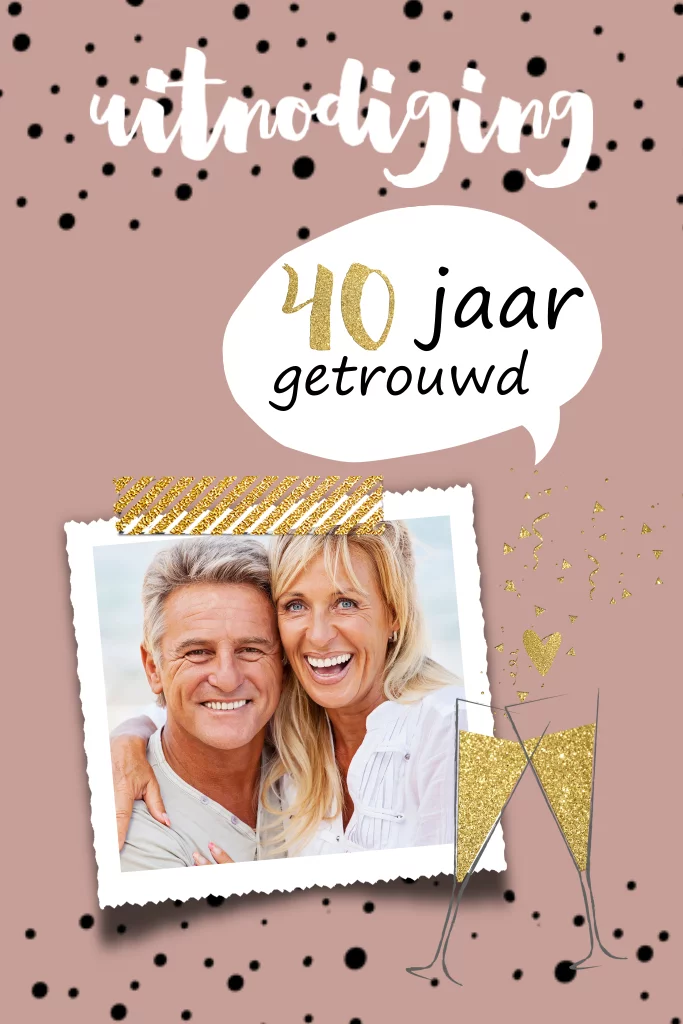 Eerdaags jullie 40 jarig huwelijks jubileumfeest geven? Mooie staande foto uitnodiging met goud look (geen echt goud inkt) rosy kleur met confetti op de ondergrond, champagne glazen en tekstballon.