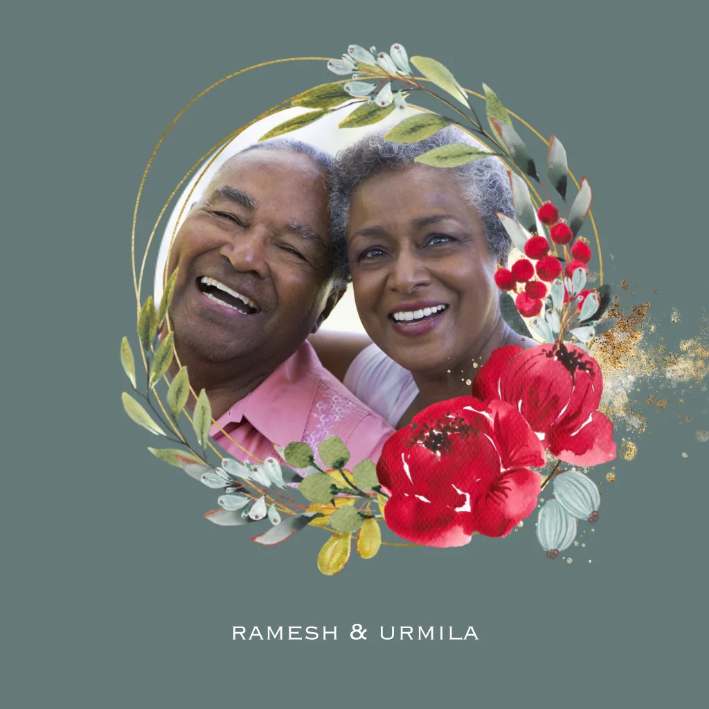 40 jaar getrouwd? Stijlvolle vierkante kaart met rond fotokader op de voorzijde. Versierd met vrolijke frisse bloemen en goud look. Alles is aan te passen!
