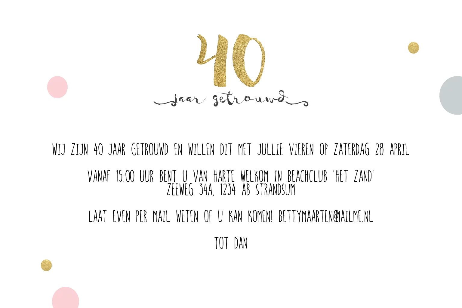 Eerdaags 40 jaar getrouwd? Mooie liggende uitnodiging met getekende champagne glazen met bruizend effect. Met goud glitter look (geen echt goud inkt) en sierlijk lettertypen. Alles is te bewerken!
