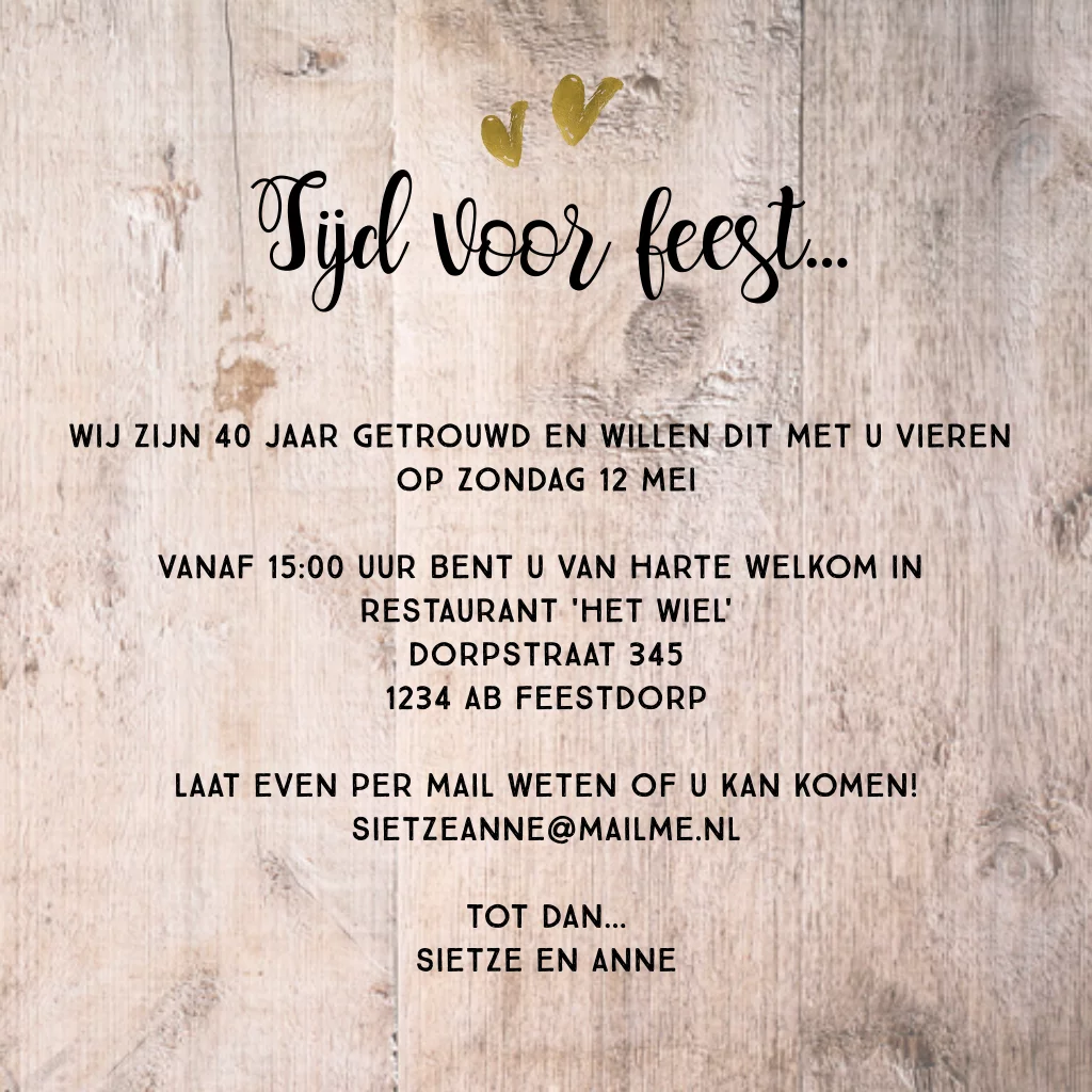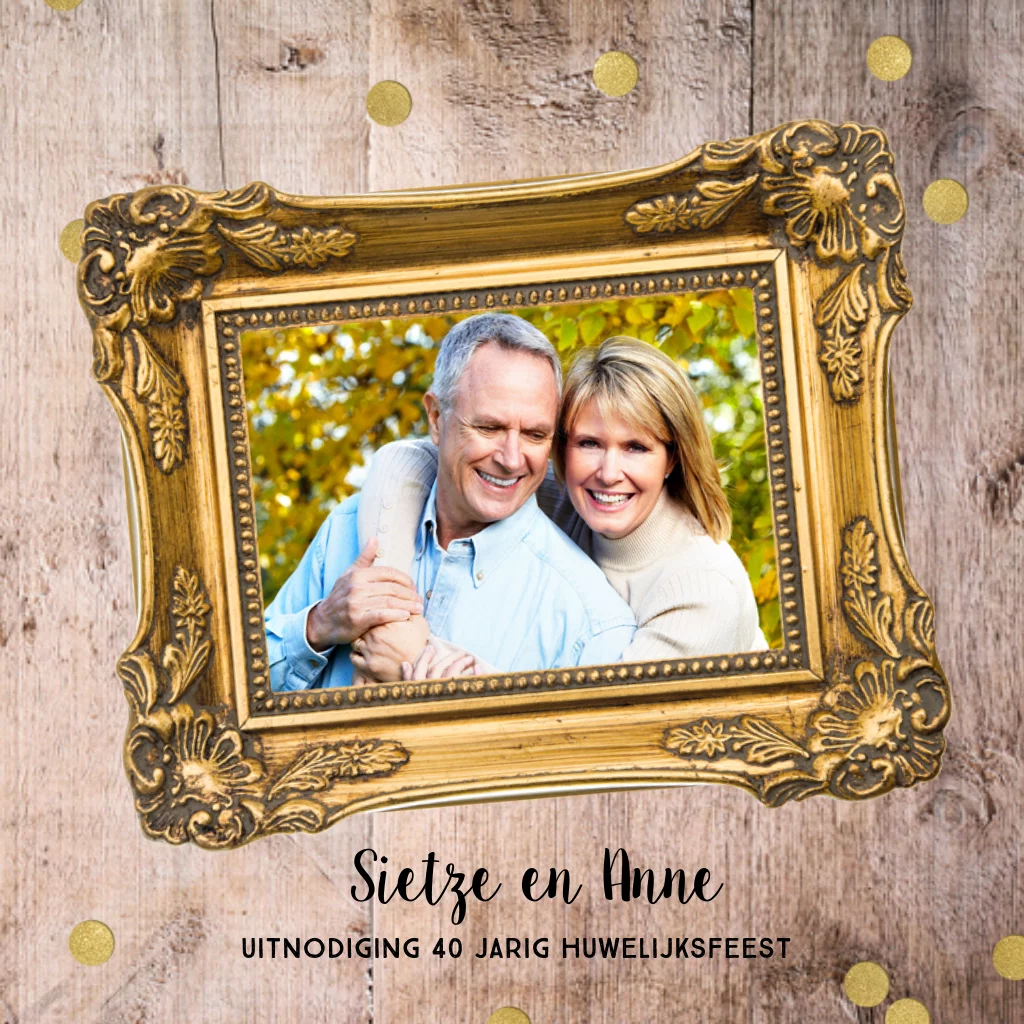 Unieke foto 40 jarig huwelijksjubileum uitnodiging met stoere hout print op de ondergrond. Met chique goud gekleurde fotolijsten in barok stijl. Zelf maken!