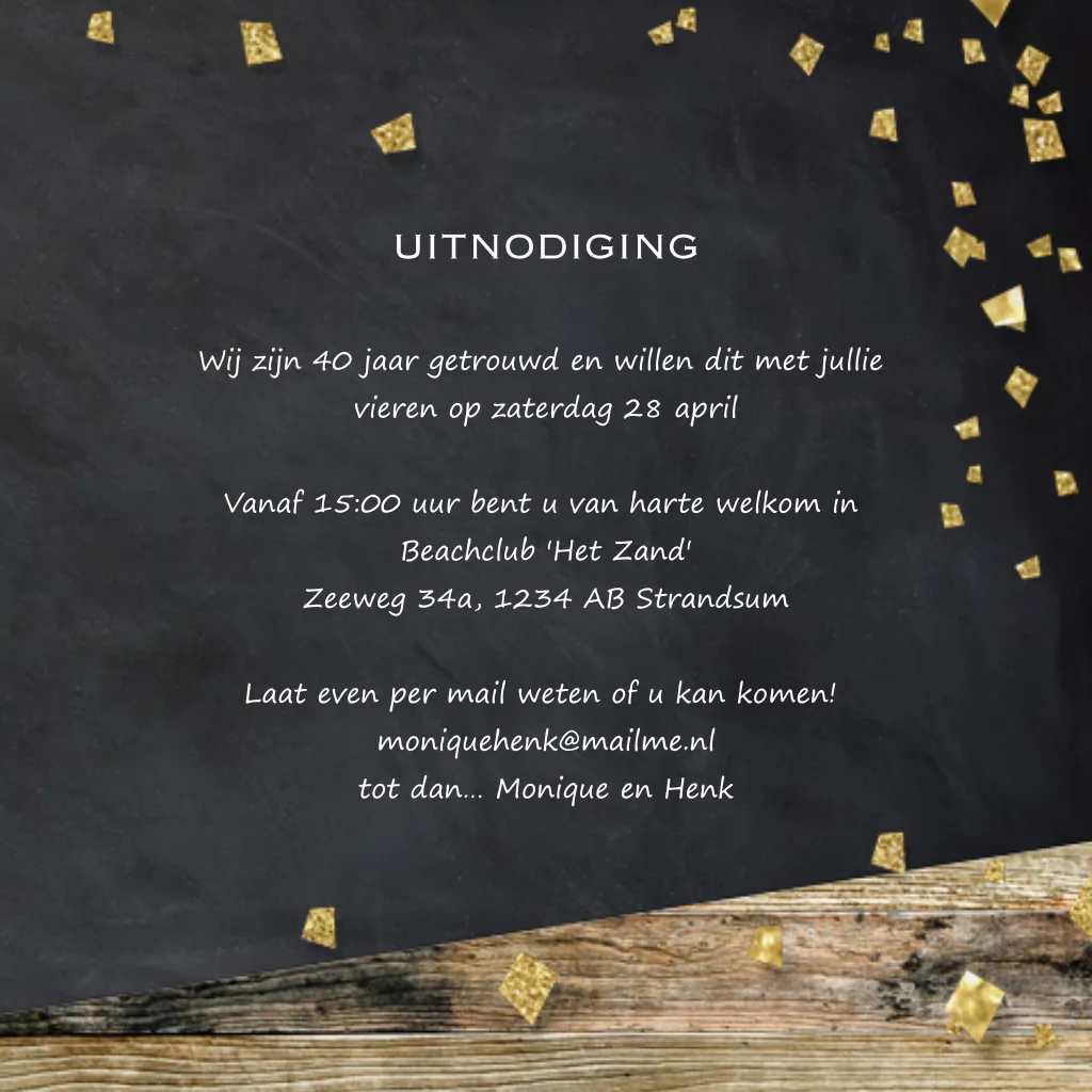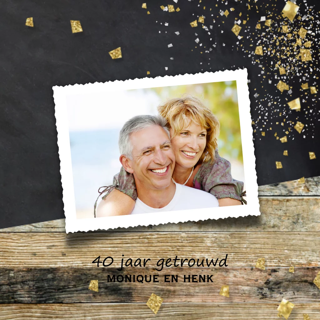 Originele uitnodiging voor jullie 40 jarig huwelijksjubileum. Achtergrond krijtbord en hout look met een schuine streep! Versierd met eigen foto kader en goud gekleurde confetti snippers.