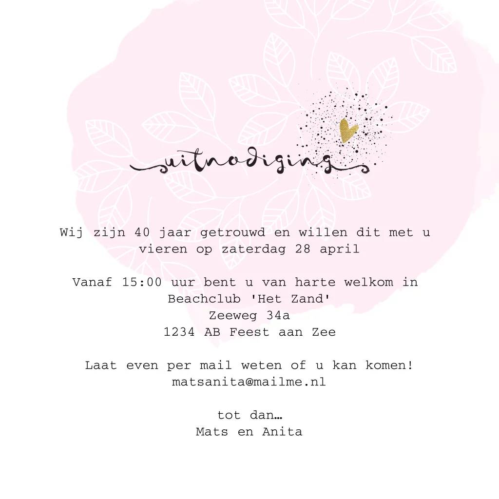 Eerdaags jullie 40 jarig huwelijks jubileum feest geven? Unieke uitnodiging met goud look (geen echt goud inkt) rose waterverf, bladeren en sierlijke lettertypes.