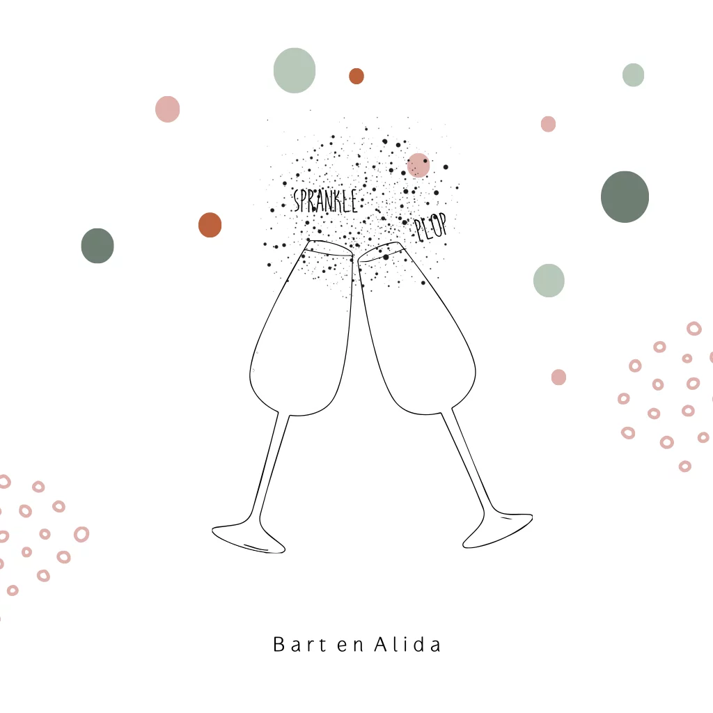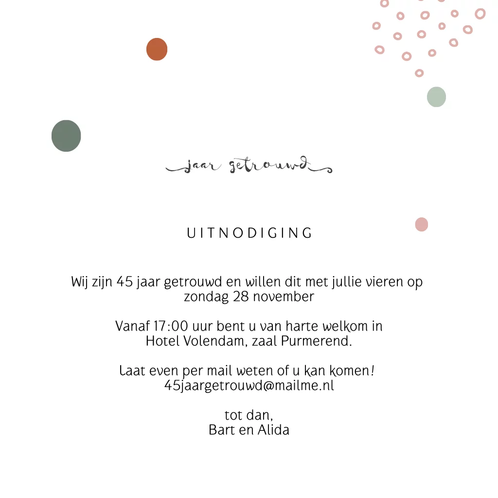 Feestelijke vierkante 45 jaar getrouwd uitnodiging met bubbels, confetti en champagne glazen gevuld met echt goud folie druk.