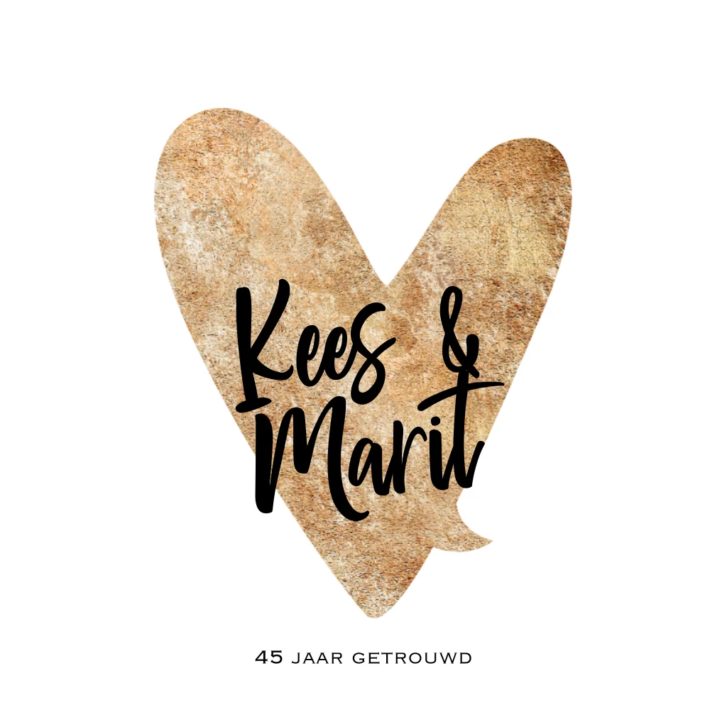 Vrolijke enkele uitnodiging voor jullie 45 jarig huwelijksjubileum. Groot goudkleurig hart in tekstwolk vorm. (geen echt goud, goudprint).